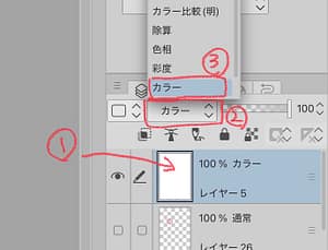 ②レイヤーモードを③「カラー」にする(こうするとイラスト全体がモノクロに見えます)